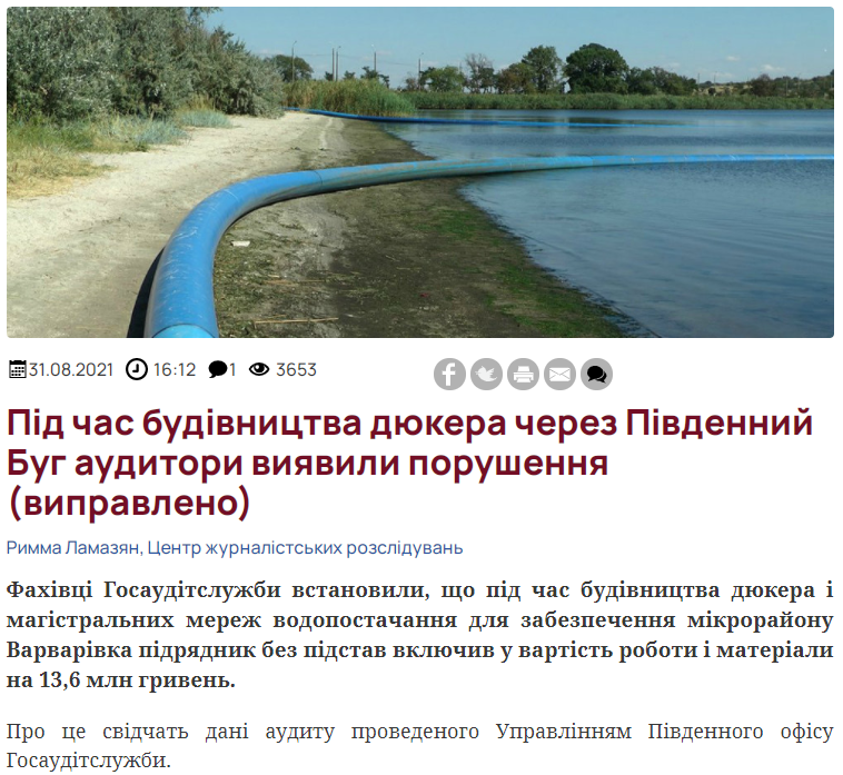В мережі інтернет на сайті nikcenter.org поширена інформація, про те, що за даними висновків Управління Південного офісу Держаудит служби Миколаївської області по об’єкту: «Нове будівництво дюкеру через річку Південний Буг та магістральних мереж водопостачання мікрорайону Варварівка у м. Миколаєві.», ТОВ «ВіК ТЕХНОЛОГІЇ» безпідставно включено у кошторис виконання робіт по укладанню трубопроводу довжиною 2,8 км на суму 475 тис. грн. та вартість самих труб на суму 13 млн.146 тис. грн. та інші порушення на суму 306,68 тис. грн. Зазначені висновки Держаудит служби є не зрозумілими та дивними для ТОВ «ВіК ТЕХНОЛОГІЇ» (надалі - Товариство), вказана у статті вартість більш ніж 13 млн. це вартість прокладених на об’єкті двох ниток трубопроводу, а саме роботи з укладання та протягування труб 2960 м та самі труби довжиною 3063,6 пог.м., у відповідності до проектно-кошторисної документації. Виходить, що державна аудиторська служба заперечує факт укладання та наявність самих труб на об’єкті! Такі висновки, навіть важко коментувати, тому як роботи завершені, трубопровід укладено відповідно до проектно-кошторисної документації з дотриманням усіх будівельних норм, стандартів та правил, об’єкт пройшов успішні іспити трубопроводу.